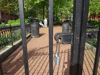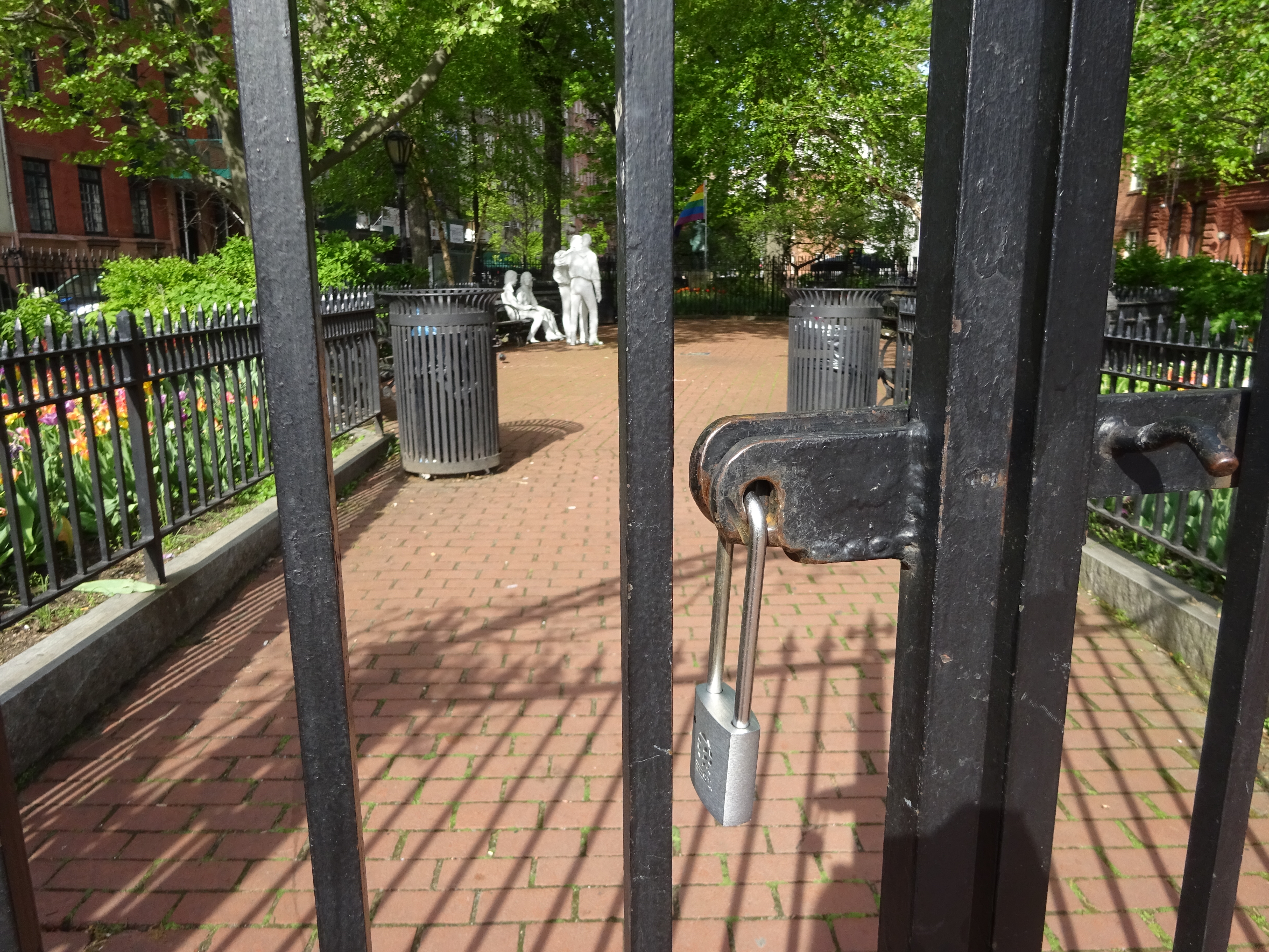 May 6: In the Village, Christopher Park is closed early and padlocked, but only on Thursdays at 4:00 or 5:00pm, just before the Stonewall Protest has its weekly rally, an event that has been going strong since July 2020. In addition, Federal Park Police are stationed with a car outside the park and they routinely go in to patrol. Parkgoers report feeling intimidated. Some leave, some relocate to Washington Square.