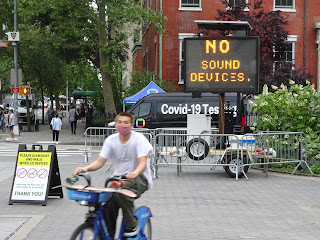 June 4: The NYPD erects a large digital traffic sign by the Washington Square Arch, spelling out the rules in light-up letters: No Skating, Bicycle Riding. No Alcohol. No Sound Devices. Dozens of police patrol the park at night, telling people to turn off any music. At 10:00 p.m., when curfew begins, cops in riot gear close the park. People leave without incident. Some go to Union Square Park, which is also closed, surrounded by police barricades.