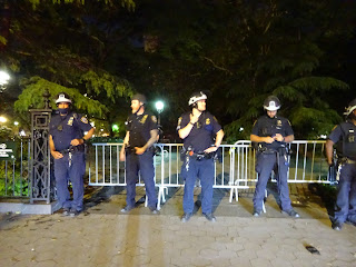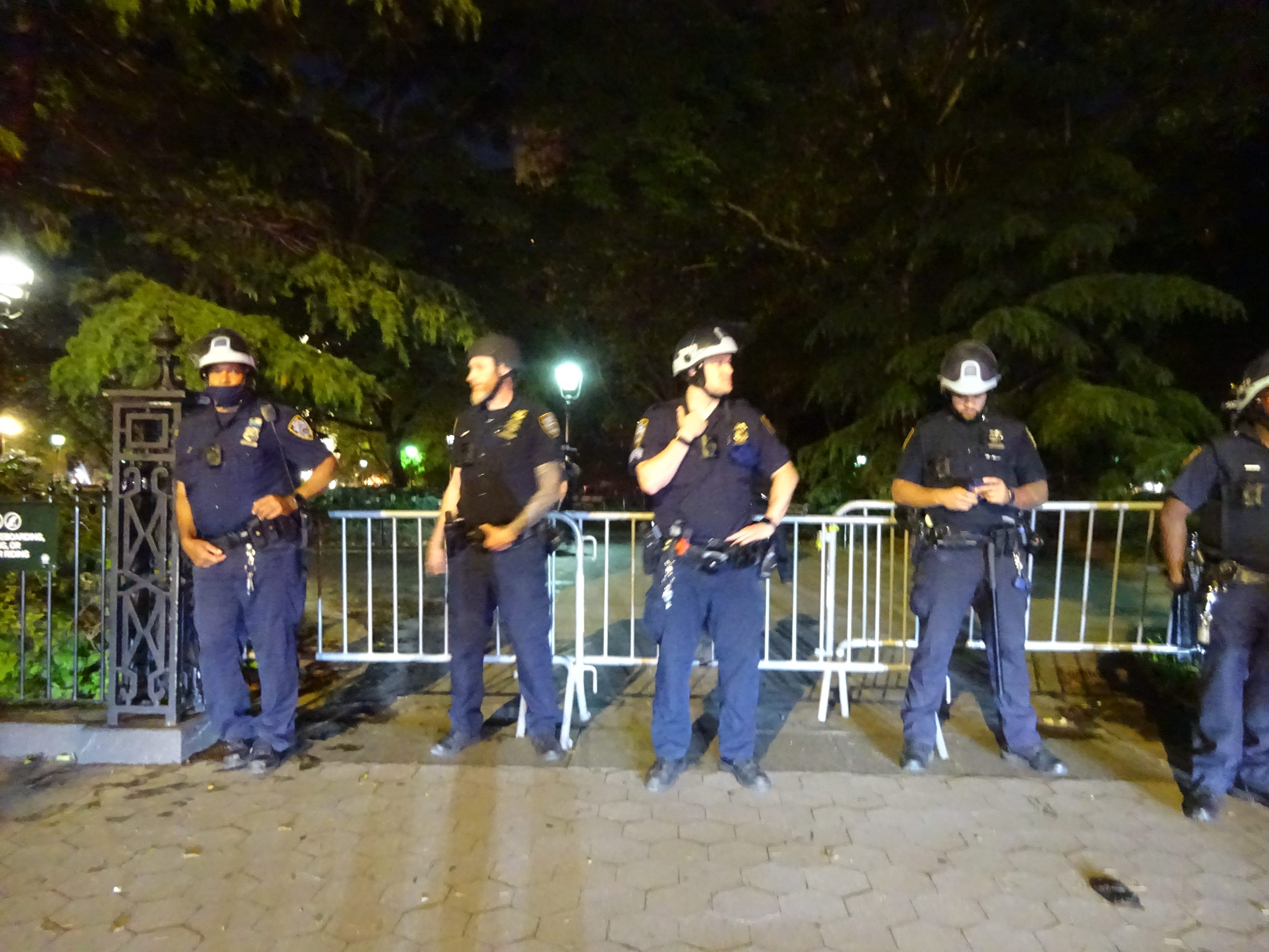 Activists arrive at Washington Square to protest the curfew. The police hit back violently with what look like hundreds of riot cops and SRG troops on bicycle. Parkgoers and protesters are pepper-sprayed and beaten. Once people are out of the park and the entrances are barricaded shut, the police charge, chasing people down Thompson Street, all the way to Houston Street, in a panicked stampede in which at least one person is trampled. In total, 23 people are arrested.